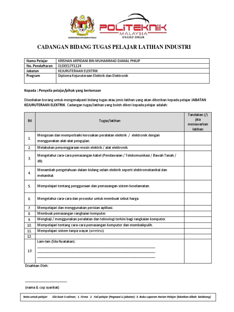 Skop tugas harus memberi peluang kepada pelajar untuk mengaplikasikan pengetahuan dan kemahiran yang dipelajari serta mendapat pendedahan amalan kerja dalam bidang pengkhususan masing-masing. Kalau perlu daftar.